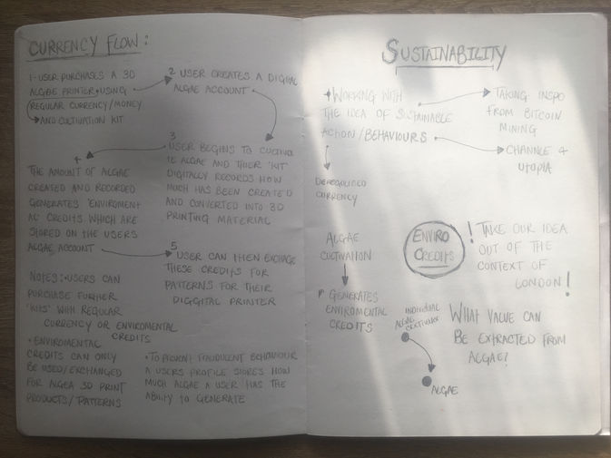 The idea was adapted/refined to again try and strive for that grounding in reality. Rather than having users grow and then refine Algae filament in their homes, the idea of a company that handled the algae refinement and product production seemed a little more feasible. All the user needed to then do, was cultivate the algae and then have it collected by the company, they would then receive credit/currency in the way of Algae Coin to use on that companies web store.